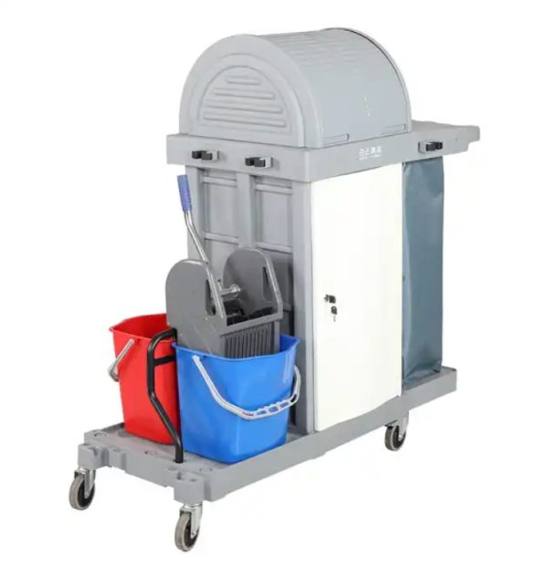Features: 4 heavy-duty caster wheels, including buckets and Canvas bag, storage lockers for cleaning materials